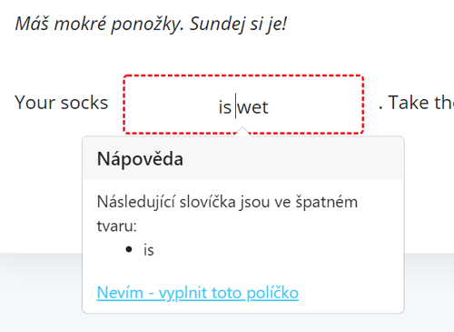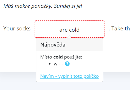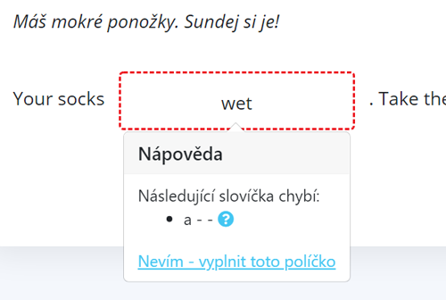 Pokud něco zapíšete do políčka špatně či jinak, než je v cílové větě zadáno, aplikace se vás pokusí navést na správné řešení. Na doplnění každého textového políčka máte neomezený počet pokusů. Pokud byste si přesto nevěděli rady, můžete kdykoliv kliknout na “nevím – vyplnit toto políčko”. Počítač políčko vyplní za vás.