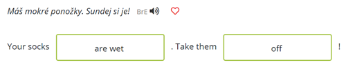 Vidíte, že je vždy zadaná věta v češtině a pod ní je anglická věta, kam uživatel zapíše – přeloží chybějící části. V tomto konkrétním příkladu chybí vždy buď jedno nebo dvě slovíčka. Správně doplněná věta by potom vypadala takto: