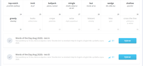 Po skončení každého měsíce vytváříme vždy jeden až dva testy (výběr z možností A/B/C/D), které se zaměřují na probraná slovíčka z daného měsíce. Tyto kvízy se vždy zpětně objeví pod kalendářem za příslušný měsíc.